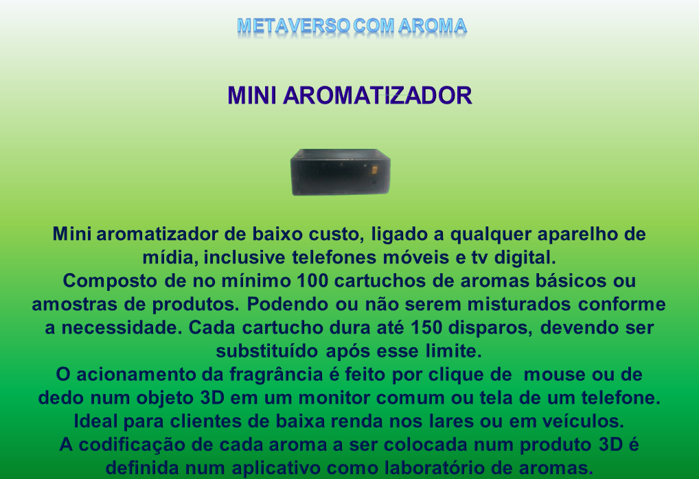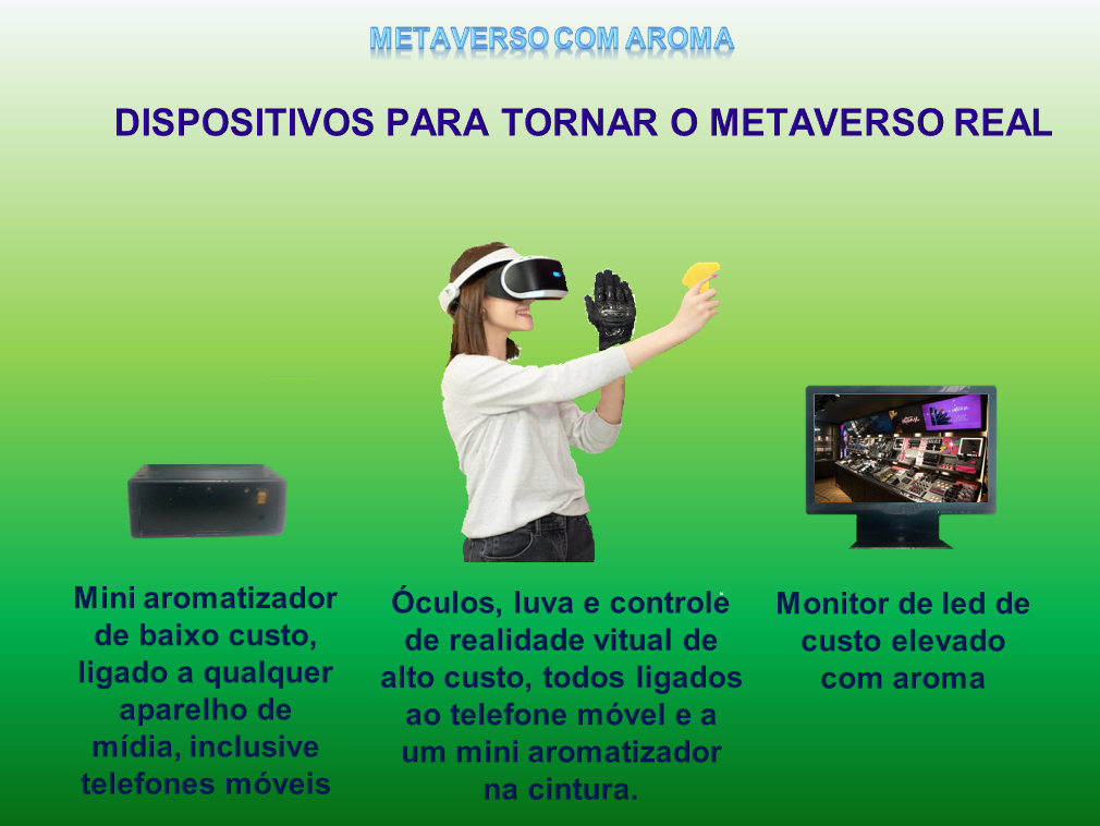 Um Metaverso com Aroma é um ambiente digital tridimensional interativo internacional, onde as pessoas irão interagir entre si por meio de avatares (personagens) digitais que podem ter seu próprio perfume digital, incluindo games e vídeos com aromas digitais. É composto de setores, cada um com uma função seja comercial, diversão, treinamento ou trabalho.